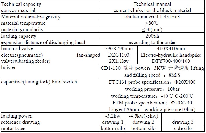 Clinker bulk loader is a kind of equipment to convey clinker automatically from cement clinker silo to clinker bulk loading truck or ship. Bottom silo cement clinker bulk loader (see drawing 1) is made up of hand rod valve, motorized fan valve, hoister devices, flexible
