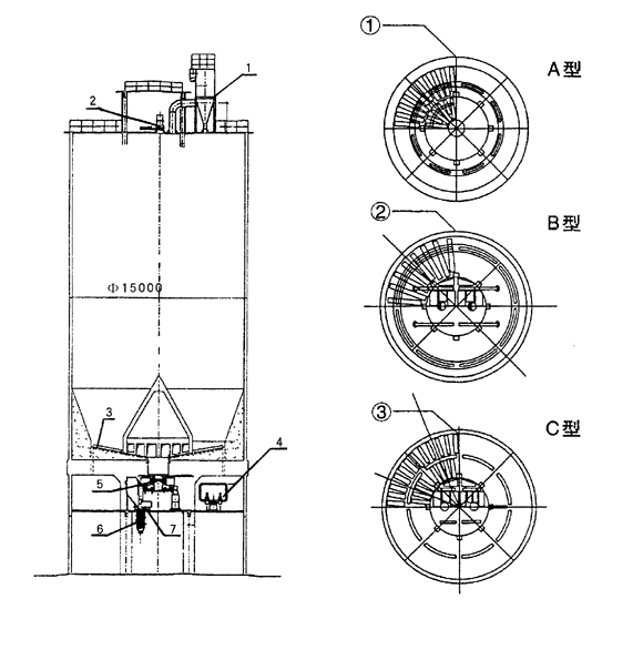 水泥储存库是在库底中心位置设一锥形混合室,以降低库内的卸料压力,消除漏斗流。混合室设8-12个进料孔,在混合室和库壁之间的环形区设有8-12个充气区,卸料时轮流向相对的环形小区充气,使部分水泥流向中心混合室。在自上而下的流动过程中,切割水平料层而产生重力混合作用,进入混合室后又因混合室内的连续充气搅拌而进一步均化。这种库的均化值可达5-9。电耗0.15-0.30kwh/t。