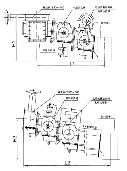 库底卸料装置由库底螺旋闸门、库底分料箱、电动(气动)开关阀、气动流量控制阀、电动流量控制阀、大流量粉体比例调节阀及卸料溜子组成,用于水泥生料粉或水泥的库底卸料。库底卸料装置能自动调节卸料流量且均匀,其结构合理,操作维护简单方便,最多可设三个卸料口,用户也可选用库侧卸料装置。